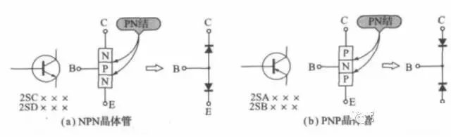 实际上三极管的NPN和PNP都是由两PN结构成。所以,我们可以认为,三极管的基极和发射机间与基极和集电极之间连接2个二极管。在一般的放大电路中,使基极和发射极之间的二极管导通,使基极和集电极之间的二极管截止来设置三极管各端电位。