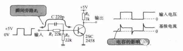 如上图所示,由于基极限流电路的作用,导致其开关速度受限。为此给限流电阻R1并联一个小容量的电容器。这样,当输入信号上升、下降时能够使R1电阻瞬间被旁路并提供基极电流,从而消除开关时间滞后。