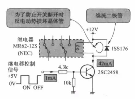 并联续流二极管后,而与二极管与继电器形成闭合回路,可以放掉继电器线圈产生的高达140V的反向电压,从而保证集电极电位不高于电源电压的0.6V,而防止晶体管被击穿。