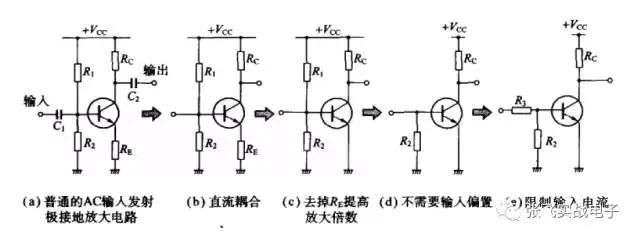 从图中可以看出,电路(a)去掉输入输出两个耦合电容后得到了电路(b),由于放大倍数是有Rc和Re两个电阻决定的,所以去掉Re后,得到了电路(c),同时,基极偏置电路也没有什么必要,当输入信号为0V时三极管处于截止状态,如图(d)。