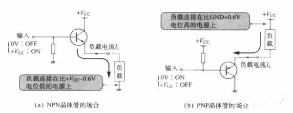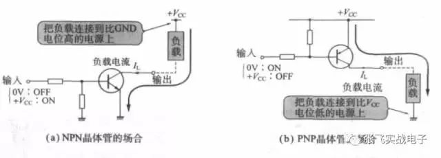 上图上边是开路集电极电路,跟负载使用电源没有关系,只要基极有电压,电路就能工作;而上图下边的是开路发射极,基极电压与负载电源是有关系的,输出电压要比输入电压低0.6V。所以,这两种开关电路各有优缺点。上边电路的开关速度不够高,还必须通过添加其他器件来提高其开关速度。而下边电路的开关速度却非常快,但输入电源和输出电源有关联。所以,在实际的应用中,比较常用的还是左边的那种方式,本人也建议尽量采用上边的(b)图,而尽量不要应用右边的这两种方式。