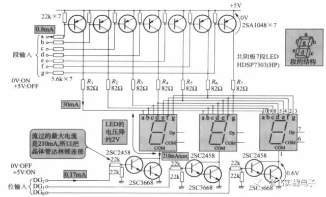 对于上图来说,每一路LED的显示和每一个LED数码管的驱动,都会使用大的电流。7段数码管的每一段LED需要打电流大概是30mA,而其电流的控制由其串联的限流电阻确定。我们之前也说过,一般LED的工作压降为2V,所以LED的工作电流I=5-2-0.6/82=30mA。