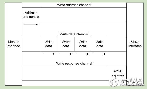 地址通道携带控制消息用于描述被传输的数据属性,数据传输使用写通道来实现“主”到“从”的传输,“从”使用写响应通道来完成一次写传输;读通道用来实现数据从“从”到“主”的传输。