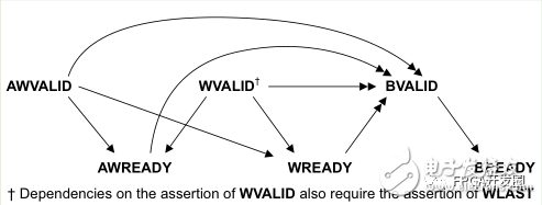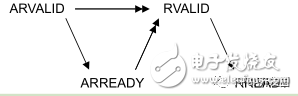 为防止死锁,通道握手信号需要遵循一定的依耐关系。①VALID信号不能依耐READY信号。②AXI接口可以等到检测到VALID才断言对应的READY,也可以检测到VALID之前就断言READY。下面有几个图表明依耐关系,单箭头指向的信号能在箭头起点信号之前或之后断言;双箭头指向的信号必须在箭头起点信号断言之后断言。