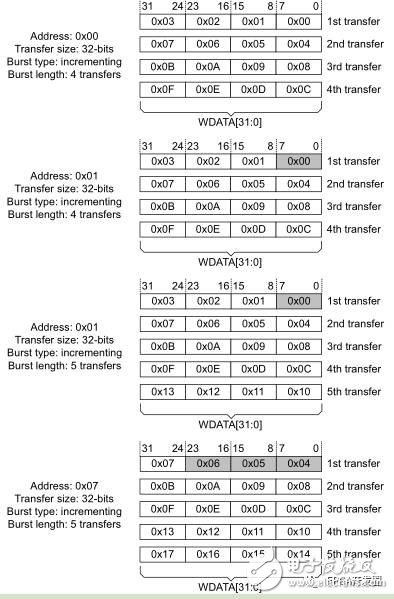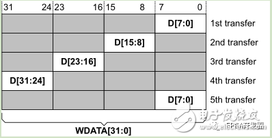 下图给出了5次突发传输,起始地址为0,每次传输为8bit,数据总线为32bit,突发类型为INCR。