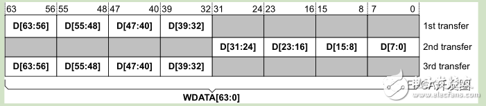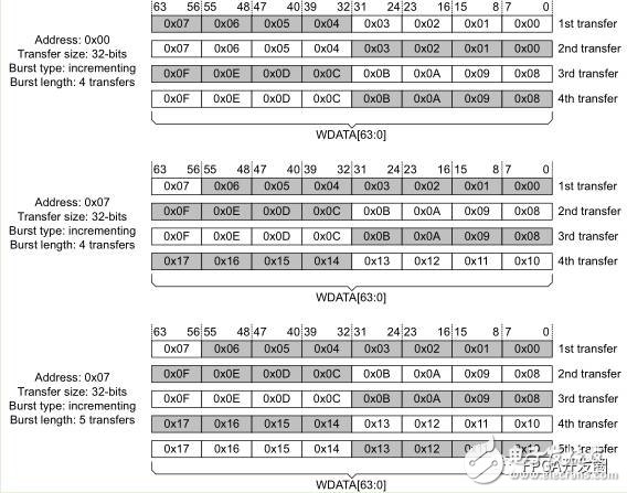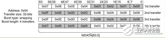 下图给出3次突发,起始地址为4,每次传输32bit,数据总线为64bit。