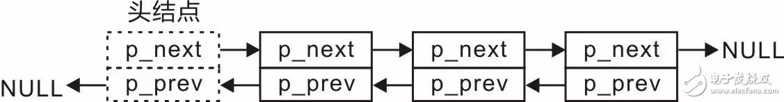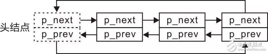 在图3.15中,头结点的p_prev和尾结点的p_next直接被设置为了NULL,此时,如果要直接由头结点找到尾结点,或者由尾结点找到头结点,都必须遍历整个链表。可以对这两个指针稍加利用,使头结点的p_prev指向尾结点,尾结点的p_next指向头结点,此时,该双向链表就成了一个循环双向链表,示意图详见图3.16。