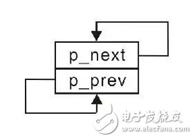 由于此时还没有添加其它任何结点,仅存在一个头结点,因此该头结点既是第一个结点(头结点),又是最后一个结点(尾结点)。按照循环链表的定义,尾结点的p_next指向头结点,头结点的p_prev指向尾结点,仅有一个结点的示意图详见图3.17。