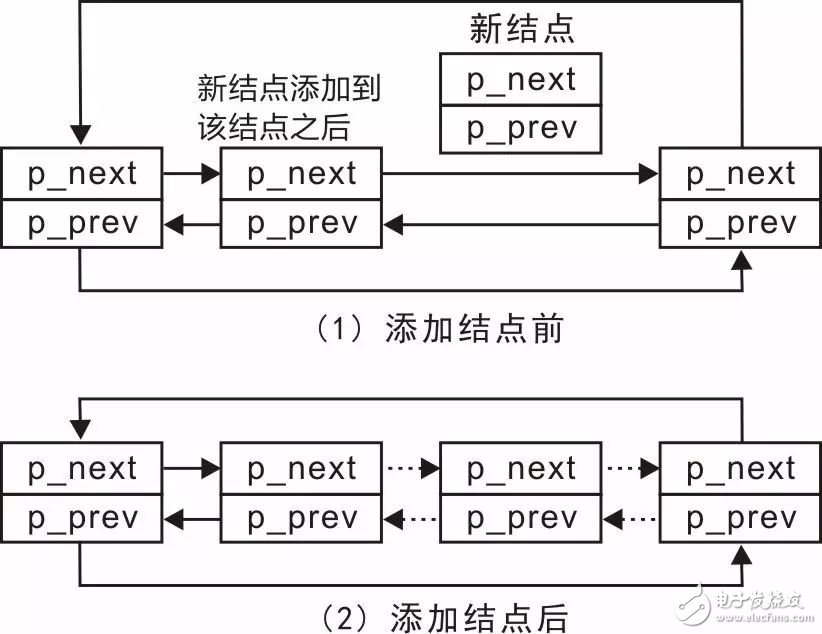 实际上循环链表,无论是头结点、尾结点还是普通结点,其本质上都是一样的,均为p_next成员指向下一个结点,p_prev成员指向其上一个结点。因此,对于添加结点而言,无论将结点添加到链表头、链表尾还是其它任意位置,其操作方法完全相同。为此,需要提供一个更加通用的函数,可以将结点添加到任意结点之后,其函数原型为: