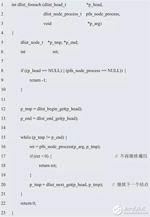 dlist_node_process_t类型参数为一个p_arg指针和一个结点指针,返回值为int类型的函数指针。每遍历到一个结点均会调用pfn_node_process指向的函数,便于用户根据需要自行处理结点数据。当调用该回调函数时,传递给p_arg的值即为用户参数,其值与dlist_traverse()函数的第3个参数一样,即该参数的值完全是由用户决定的;传递给p_node 的值即为指向当前遍历到的结点的指针。当遍历到某个结点时,如果用户希望终止遍历,此时,只要在回调函数中返回负值即可终止继续遍历。一般地,若要继续遍历,则函数执行结束后返回0即可。dlist_foreach()函数的实现详见程序清单3.46。