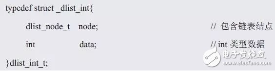 同样以int类型数据为例,来展示这些接口的使用方法。为了使用链表,首先应该定义一个结构体,将链表结点作为其一个成员,此外,再添加一些应用相关的数据,如定义如下包含链表结点和int型数据的结构体: