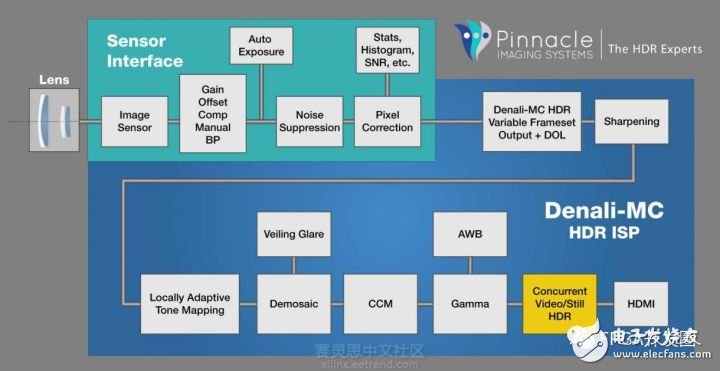 Pinnacle Denali-MC:在Pinnacle推出的Denali-MC IP平台中嵌入了一个Sony的IMX290LQR传感器,同时还可用通过Xilinx Zynq 7045 FPGA芯片内部的可编程部分实现多种帧设置的输出和Sony 的DOL HDR模式驱动。基于此,Pinnacle成像系统的Denali-MC HDR 视频和HDR still ISP(图像信号处理器)IP变得动态可配置,最吸引人之处在于它现在可以支持29种不同的具有HDR渲染能力的图像传感器,其中包括九种Aption/ON Semi的产品,六种Omnivison产品,以及十一种Sony索尼传感器,同时通过一个16位的处理器还支持十二种不同级别的像素增强和HDR帧设置方法。鉴于这款图片处理IP的强大兼容性,它具有广泛的应用场景,其中包括以下几种应用(但绝不仅仅限于这几种):