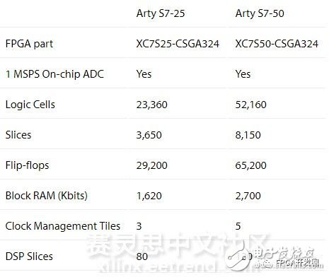 前段时间,Digilent为Arty FPGA开发板系列增加了新的成员——两种不同规格的新的Arty S7,这款FPGA开发板是基于中等大小(size)的Xilinx Spartan-7 FPGA系列芯片而开发的。该类开发板主要分为两种Size,一种是基于Spartan-7 S25的价值89美刀的Arty S7-25,另一种是Size较大的价值109美刀的Arty S7-50,这款Arty开发板基于Spartan-7 S50器件实现,相较于之前那款可以为用户提供更多可用开发资源。下表是这两款Arty FPGA开发板的资源参数比较: