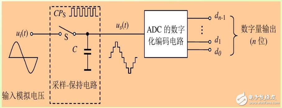 模数转换的方法也有很多,在电学方面我们通常使用ADC进行信号采样,以达到模数转换的效果,基本原理就是通过一定的采样保持电路将信号引入,然后用ADC芯片进行数据采样,ADC芯片的位数越多,采样速度越快,采出来的信号就越精准越密集,模数转换的过程如下图所示。