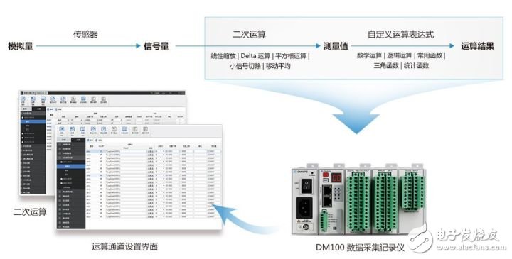 DM100数据采集模块在采集信号量后,用户可通过线性缩放、Delta运算、平方根运算等二次运算得到所需的测量值,同时还能对测量值进行自定义表达式运算,将测量值或运算值作为变量在表达式中执行,保存运算结果。并可将测量数据及时保存在内存中,支持8G以上存储容量,连续记录测量数据可达60天以上,并可根据指定通道生成报表,导出文本或二进制格式,方便数据的统计与分析。