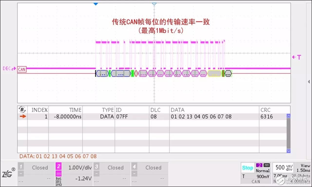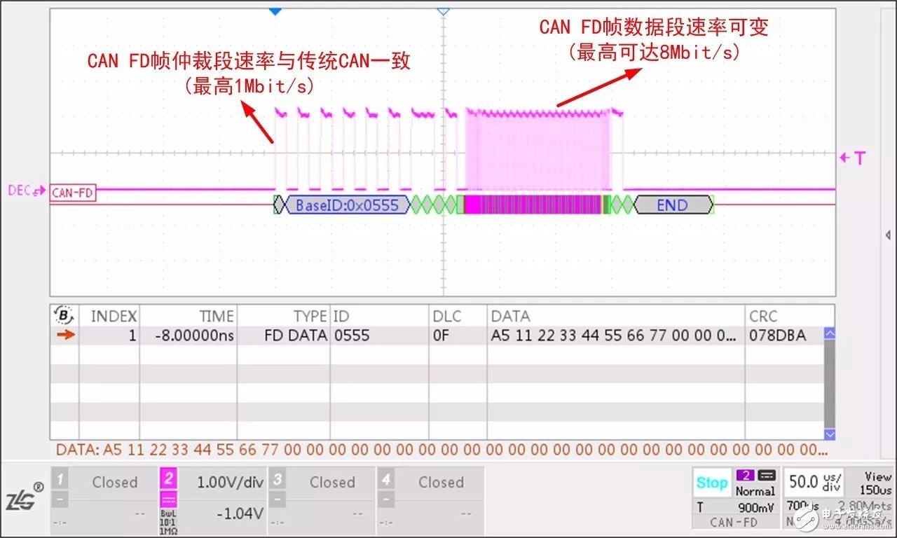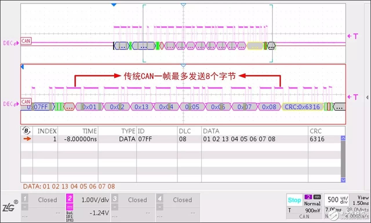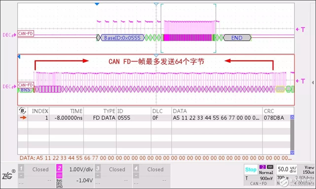 传统的CAN一帧最多只能传输8个字节的数据,而CAN FD一帧最多可传输64个字节,可以有效地避免数据拆分传输的情况。实测波形对比如图3、图4。