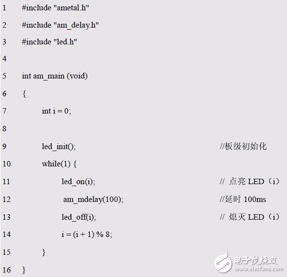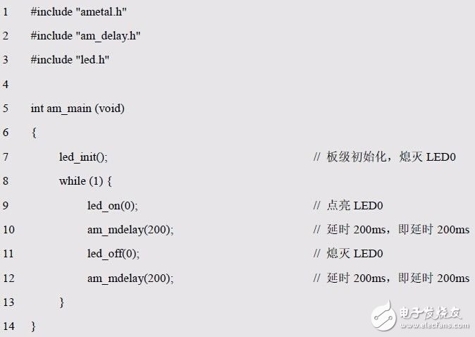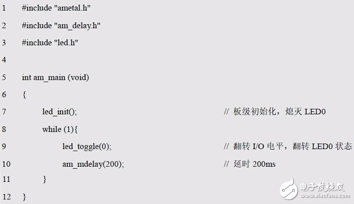 其实LED 不停地闪烁就是让一个I/O 不断翻转的过程,而AMetal 软件包针对LED 提供了翻转LED 状态的函数led_toggle(),优化后的代码详见程序清单4.5。