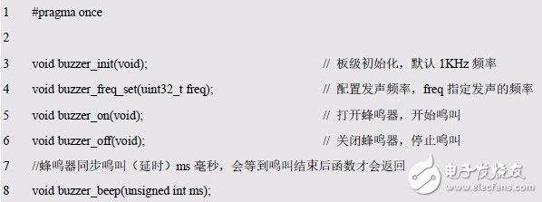 buzzer_init()会将发声频率设置为默认值:1KHz。如需修改发声频率为其它值,如:2.5KHz,则应调用发声频率设置函数,即“buzzer_freq_set(2500);”,详见程序清单4.9。
