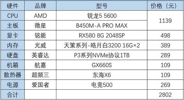 最后看一下配置单,整体上是围绕锐龙R5 5600和RX 580显卡进行的配置,核心在于CPU和显卡的性能要强,另外主板只有2条内存插槽,所以一次插满32G不用担心后续升级问题,最后3A平台让整体的游戏性能提升25%以上,价格还便宜了342元,让我们喊出AMD YES!
