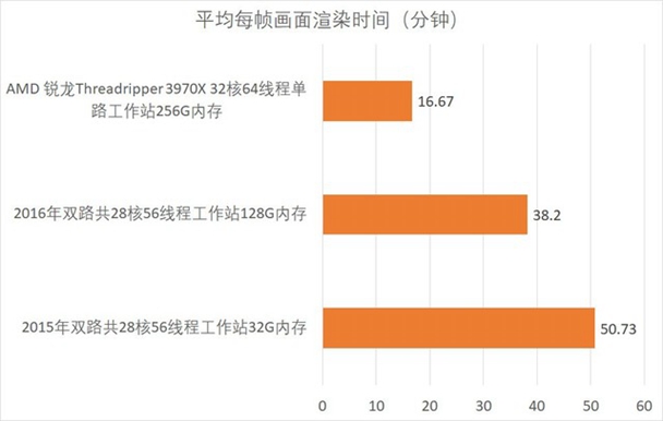 来自花开影视的IT负责人 杨立,也是我们本次试用活动的试用官,给我们分享说,他现在使用的这台工作站大概是5年前购买的,搭载双路处理器,一共有28核56线程,搭载了128G内存,已经用了一段时间,绘制的时候还是比较顺畅的,但一到解算渲染,就需要等上好久,比如这个画面的渲染,用这台旧工作站渲染的时候平均每帧画面需要大约38.2分钟,但当他试用了搭载AMD 锐龙Threadripper 3970X处理器的工作站之后,同样的场景渲染每帧平均只需要16.67分钟就可以解算渲染完成,效率提升了近130%,这让他十分欣喜。