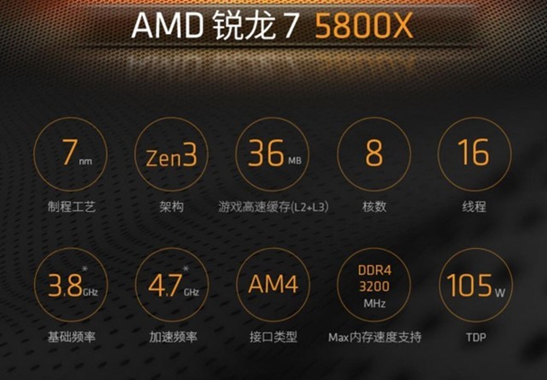 MD锐龙7 5800X采用了7nm工艺和ZEN3架构,拥有8核心16线程,CPU主频为3.8GHz,加速频率为4.7GHz,三级缓存32MB,热设计功耗105W。