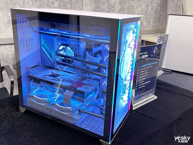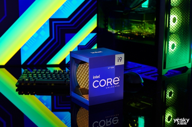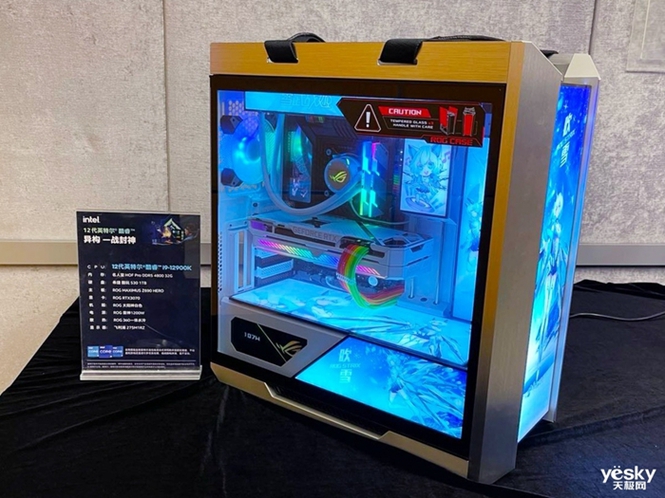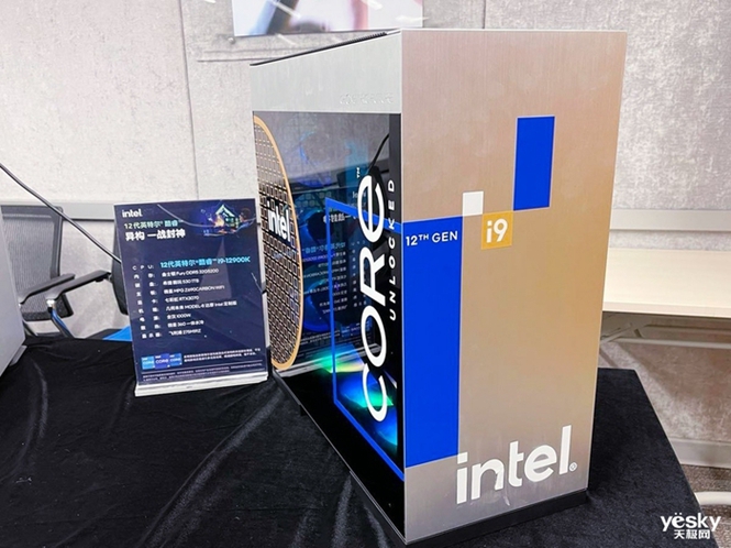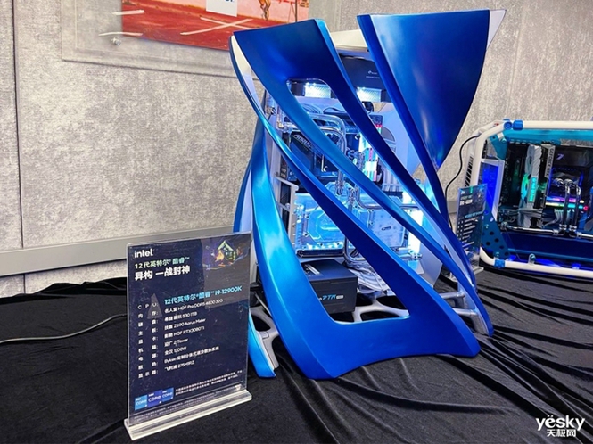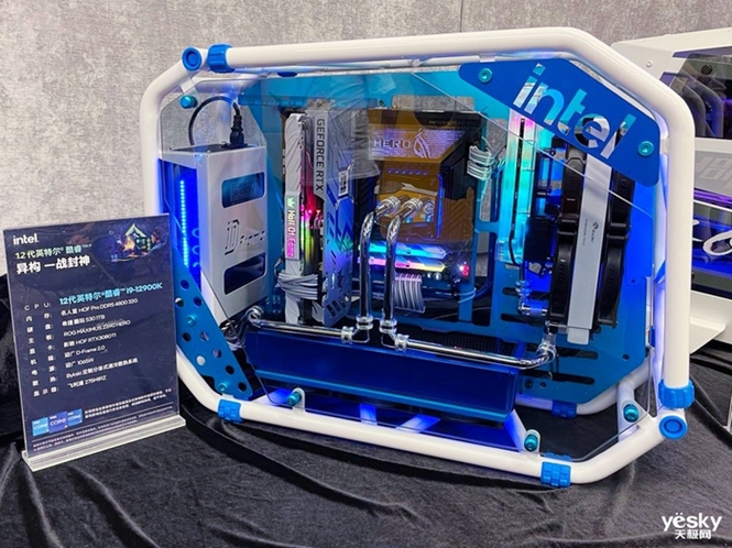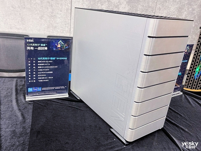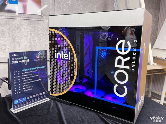 这些台式机外观轻轻松就可以给吃瓜群众留下深刻印象,尤其是英特尔定制的主题机箱,可以看到英特尔logo、12代酷睿等元素。