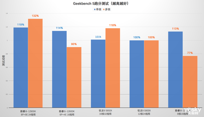 在GeekBench5测试中,英特尔 i9-12900K的单核成绩领先锐龙95950X达17%,领先锐龙95900X约19%;多核性能也超越了锐龙95950X约12%,领先锐龙95900X达到32%。