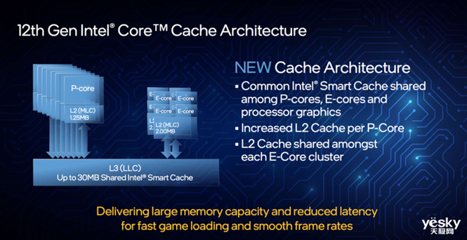 12代酷睿不仅率先采用了Intel7(10nm)制程工艺,同时还带来了x86史上最重要的一次创新混合架构。在12代酷睿中英特尔首次采用了性能核(P核)与能效核(E核)两种不同核心,比如英特尔 i9-12900K拥有8个性能核以及8个能效核,从而更好地兼顾负载对于高频率、多线程的需求。并且,12代酷睿的每个性能核都拥有独立的1.25MB二级缓存,能效核为四个核心一组共享2MB二级缓存;同时性能核、能效核共享三级缓存,因此英特尔 i9-12900K拥有14MB二级缓存,以及相比上代几近翻倍的30MB三级缓存。