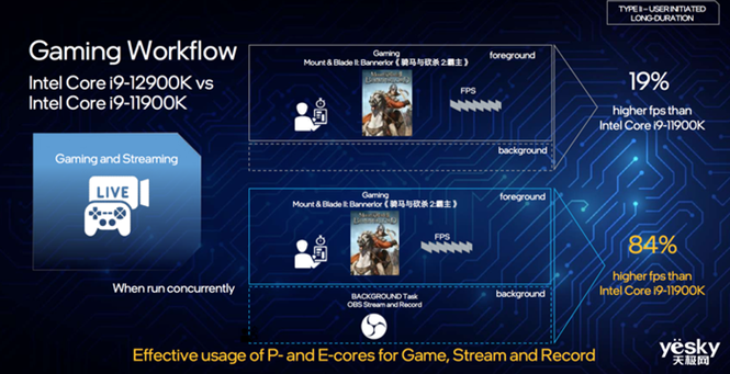 比如视频中展示的游戏场景,凭借英特尔硬件线程调度器可以将游戏运行等主要任务交由性能更强劲的性能核,保证游戏顺畅。当玩家游戏直播或者使用其他应用时,进行灵活调度,如启动应用时性能核出手保证效率,等到应用切换至后台时,能效核接手,既可以保证录制、推流稳定,又能够为玩家提供更高帧率的游戏体验。英特尔也表示在与AMD 锐龙9的对比中,12代酷睿在游戏场景下开启直播推流后,优势更大了。