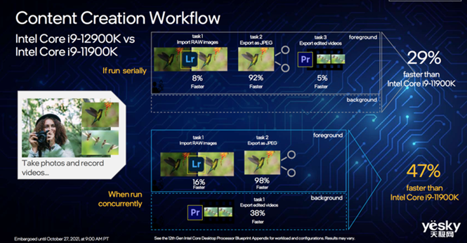 得益于此,避免用户在高负载场景下遇到程序卡顿,同时英特尔表示凭借性能混合架构以及英特尔硬件线程调度器,可以将以上工作流的效率提升47%。