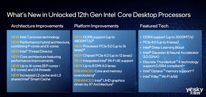 那么单核、多核性能提升都来自哪里呢?12代酷睿的混合架构与英特尔硬件线程调度器、DDR5与PCIe5.0、AI等黑科技、新特性是关键。