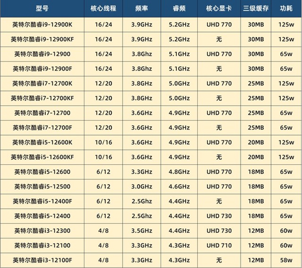 酷睿i7有两个型号,酷睿i7-12700和酷睿i7-12700F, 拥有16核心24线程,8大核4小核设计。酷睿i5的型号友款,分别为酷睿i5-12600、酷睿i5-125400、酷睿i5-12400和酷睿i5-12400F,全部都为6核心12线程,只搭载了性能核,没有能效核。酷睿i5-12600和酷睿i5-125400核显型号为UHD 770,而英特尔酷睿i5-12400自带核显为UHD 730。