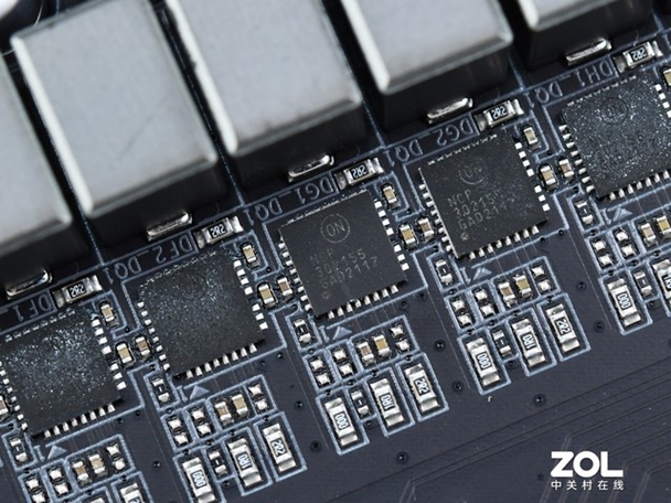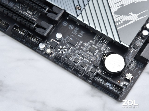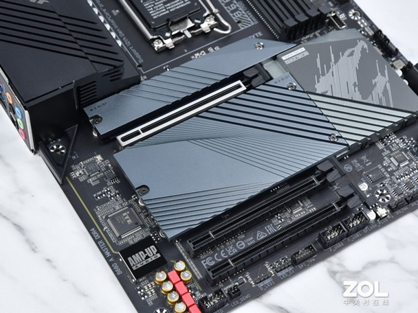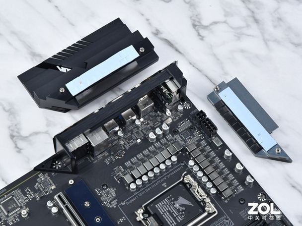 为了保证这款主板供电散热稳定, 技嘉在VRM供电区域准备了一个超大的金属散热片覆盖,一体化散热片设计,底部还有导热垫辅助散热。同时电路板也使用2盎司铜电路板设计,既能强化供电又具有一定辅助散热能力。