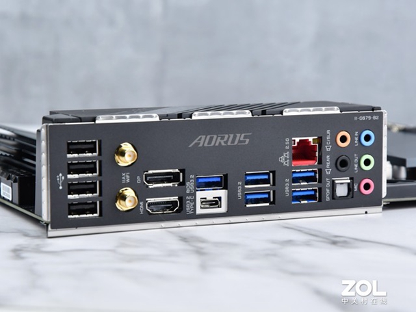 I/O区域,这款主板预装了I/O背板,既美观又便于安装,接口方面提供4个USB 2.0接口,5个USB 3.2接口,一个USB 3.2 GEN2x2 Type-c接口。此外还有一个HDMI接口,一个DP接口,一个2.5G有线网口和WiFi 6天线接口。目前2.5G网卡+WiFi 6已经成为12代平台的标配,网络上会有出色的体验。最后就是5个常规音频接口。