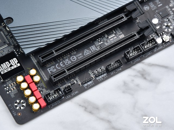 这款主板提供三个PCIe x16长插槽,第一跟插槽采用金属加固,带宽为PCIe 4.0 x16,剩下两根为PCIe 3.0 x4和PCIe 3.0 x1。