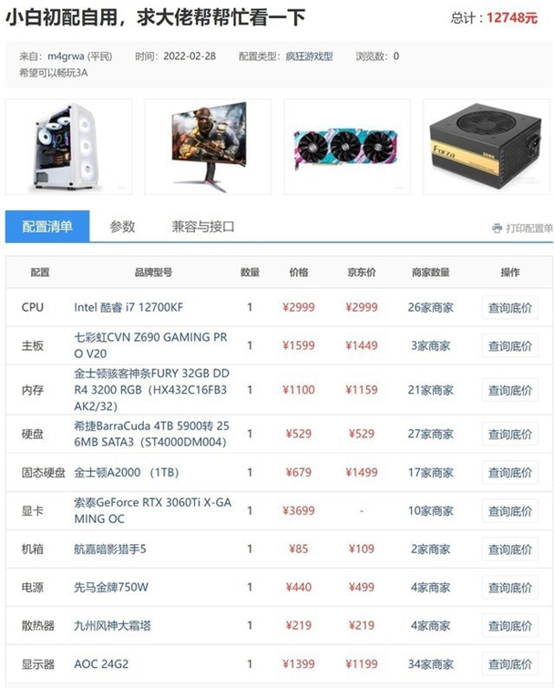 这套配置首先可以优化的是CPU,网友选择的是12核心20线程的酷睿i7-12700KF,这款高端处理器玩3A游戏当然没有问题,而且戳戳有余。但如果仅仅是为流畅3A,上酷睿i7-12700KF显然有些大材小用,而且网友选择的显卡是RTX3060Ti,这款显卡在30系显卡中不算高端,能够打造发烧级游戏平台酷睿i7-12700KF搭配RTX3060Ti这种偏入门的RTX30系显卡太浪费了,除非在玩3A游戏的同时兼顾一些视频剪辑等内容创作,那么才值得上酷睿i7-12700KF。
