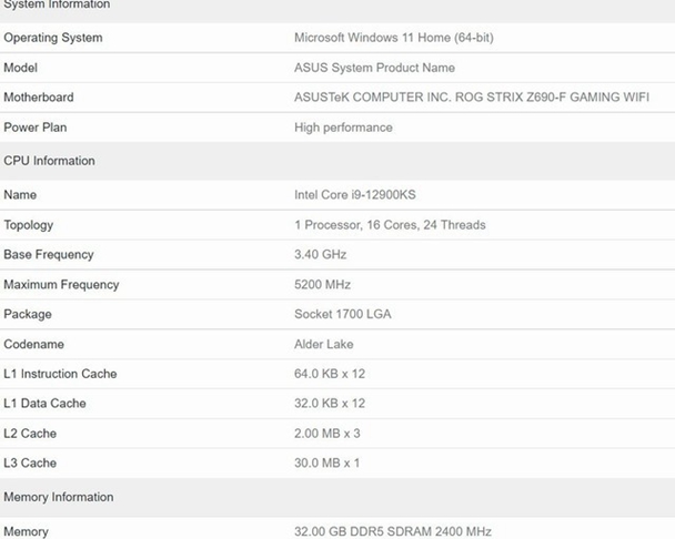 目前这款处理器已经在Geekbench数据库中现身,搭配了华硕 ROG STRIX Z690-F 主板上试,使用32G DDR5-4800 内存。