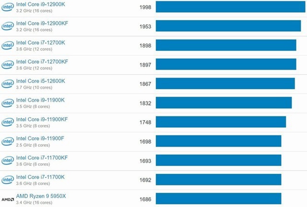 英特尔 i9-12900KS在Geekbench单核测试得分 2080 到 2101 分,在多核 Geekbench V5 测试中得分 18962 到 19010 分
