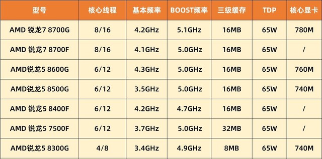 AMD 锐龙5 8600G拥有6核心12线程,加速频率4.7GHz,16MB三级缓存,65W TDP,支持DDR5,支持PCIe 4.0。