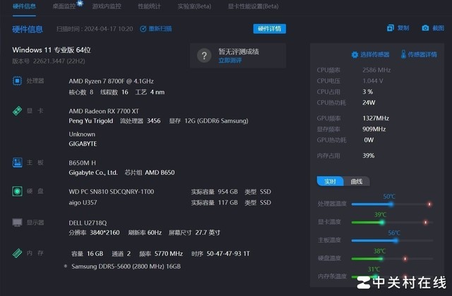 显卡方面这台AMD 锐龙7 8700F整机采用了RX 7700XT这款拥有12GB的显存显卡,主板为技嘉B650M,内存为16B三星,硬盘使用了西数SN810,并预留了不少升级空间,还内置了6把RGB风扇,确实用料十足啊。