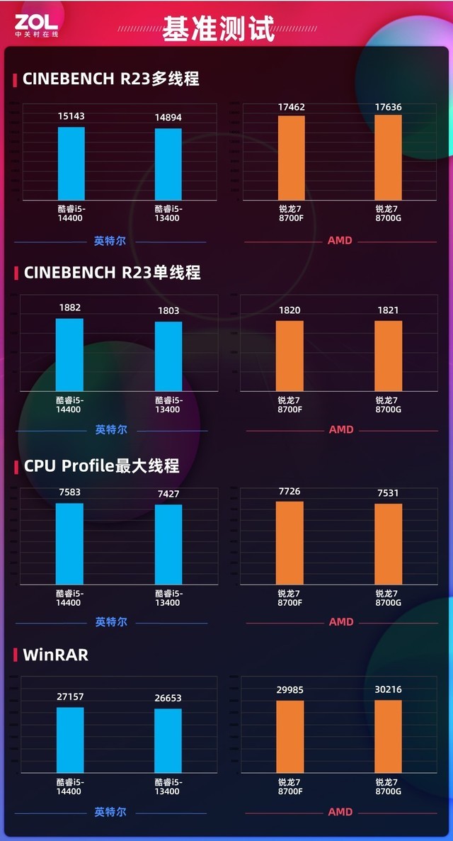 可以看到性能方面,AMD 锐龙7 8700F与AMD 锐龙7 8700G十分接近,两者参数也只有频率相差了0.1GHz,整体表现上,也要强于酷睿i5-13400和酷睿i5-14400,AMD 锐龙7 8700F虽然核心线程参数上对比酷睿i5-13400和酷睿i5-14400没有占优,但毕竟是全大核心设计,不会因为调度影响性能发挥。