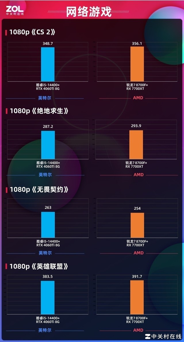网络游戏中,AMD锐龙7 8700F整机同样表现十分出色,除了《无畏契约》外,其余三款游戏帧数表现都要更强一些。就游戏而言,我们测试的这4款3A游戏以及4款网络游戏,足以说明AMD锐龙7 8700F整机的实力,目前的游戏性能表现比主流的I+N平台还要更强一些。