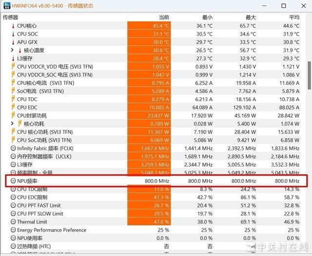 目前锐龙平台的NPU在WIN 11系统中是隐藏的,需要等后续微软更新才能直接显示,不过通过一些软件我们也能看到AMD 锐龙7 8700F搭配的NPU,比如在HWiNDO64传感器中,就可以读取到NPU的信息。