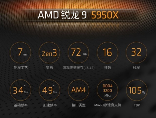 AMD 锐龙9 5950X 16核心/32线程,3.4GHz ,105W,8M二级缓存