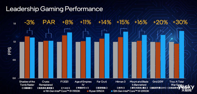 根据英特尔公布的数据显示,在测试的30余款游戏中,英特尔 i9-12900K能在大多数游戏中领先锐龙9 5950X,其中《超级房车赛2019》领先达至了20%,《军事冲突巨作米利都》领先共约30%。因而,继11代酷睿i9-11900K之后,凭借着英特尔 i9-12900K,英特尔仍旧把“最强游戏处理器”的称号攥在手里。
