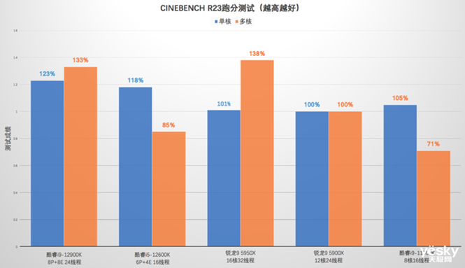 在CINEBENCH R23测试中,英特尔 i9-12900K的单颗战绩领先锐龙9 5950X达21%,领先锐龙9 5900X约23%;多核性能落后锐龙9 5950X约3%,领先锐龙9 5900X达至33%。