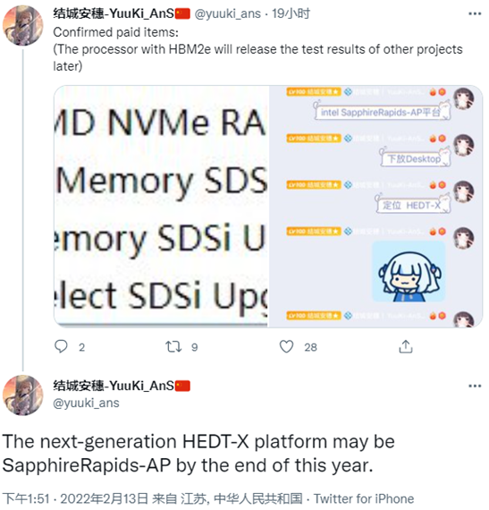 在最近泄露的与Xeon(志强)CPU基准测试中,博主@城安穗-YuuKi_AnS 表示,英特尔正在酝酿Sapphire Rapids-AP新阵容。其中“AP”尾缀曾被用于使用MCM多芯片方案的旗舰级Cascade Lake-AP产品线上;Sapphire Rapids-SP列已采用过4组MCM设计,每颗芯片最多拥有15个核心(英特尔启用其中14个)。