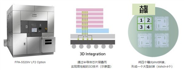 佳能介绍,通过0.8μm的高解图像力和拼接曝光技术,可以对100x100mm的超大视场进行曝光,从而实现2.5D与3D技术相结合的超大型高密度布线包的量产。