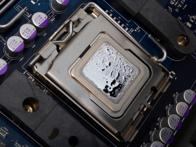 另外,液金还有一定的流动性,如果主板倾斜或竖向放置,就有可能导致液金离开CPU的范围,而CPU附近遍布元件,一旦发生短路就会损坏主板,风险非常大。网上就有非常多使用液金翻车的案例,即使是预装的液金也存在后续维护难的问题。