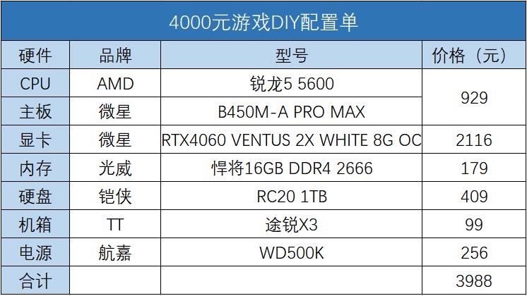 配置单里没有选机箱电源,但是这两个硬件是跑不了的,其实现在百元的机箱就有很多选择,而且钢化玻璃侧透,全面接口都很实用,RTX 4060平台配500W的电源就够,这里电源建议选好一点的,而且500W的金牌电源也很便宜了,不会给预算太多压力。